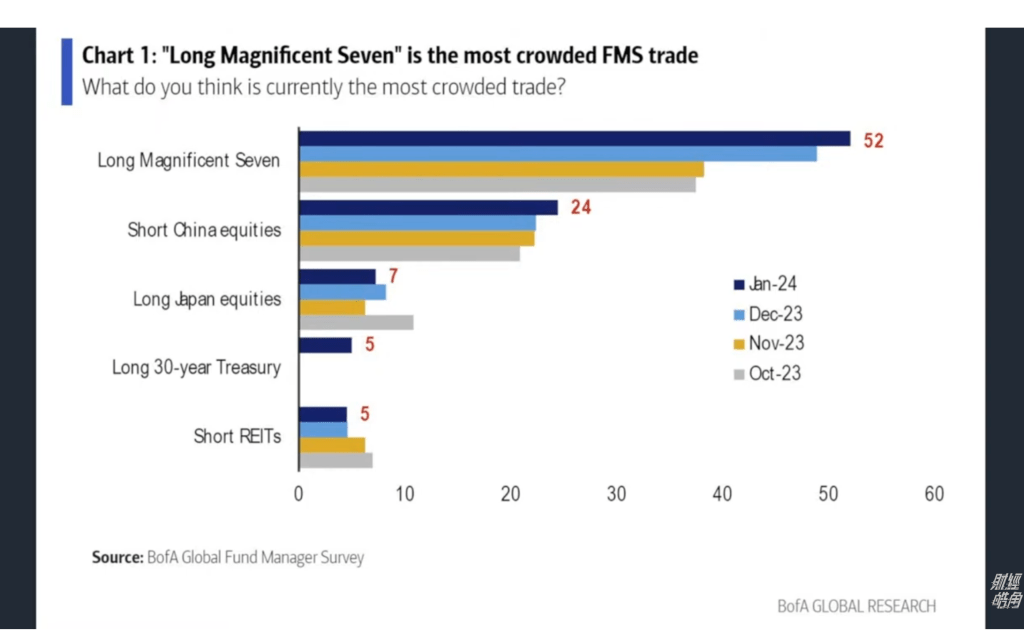其中,第一名,毫无意外的,是做多美国MAGNIFICANT 7 7大权重股。从去年10月份以来,做多MAG7的比例在逐次上升,直到2024年1月达到巅峰。这解释了1月份以来虽然只有短短2周,但是MAG7却能如此暴涨的原因。
