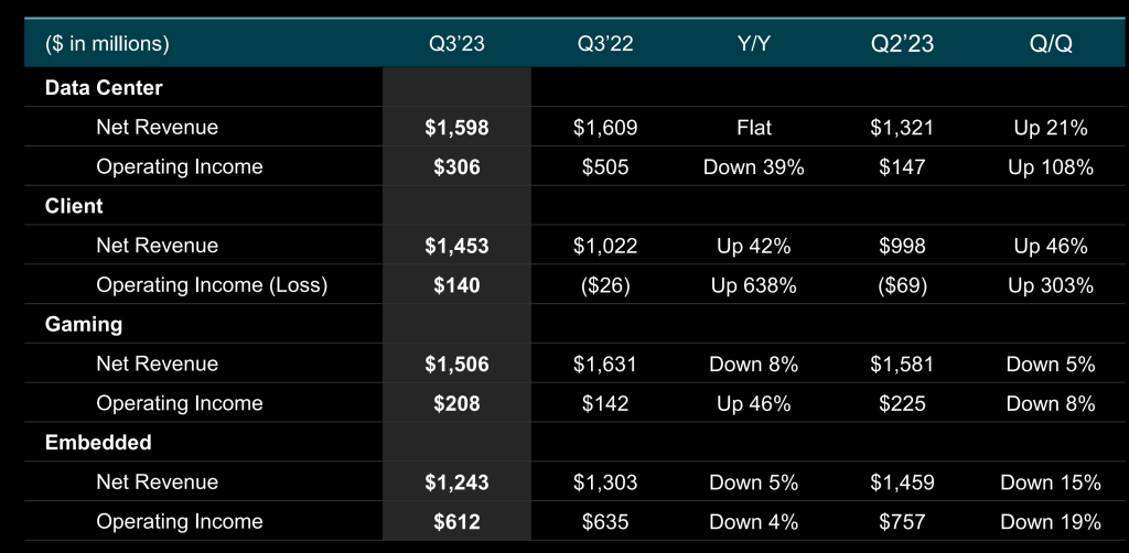 从这个收入总结我们可以看出,AMD的营收主要来自四大块,第一块是数据中心,2023年第三季度的总收入为15.98亿美元;其次是游戏(AMD的个人GPU市场),15亿美元,然后是个人市场(主要是他的台式CPU),为14.5亿美元;最后是嵌入式系统,为12亿美元。