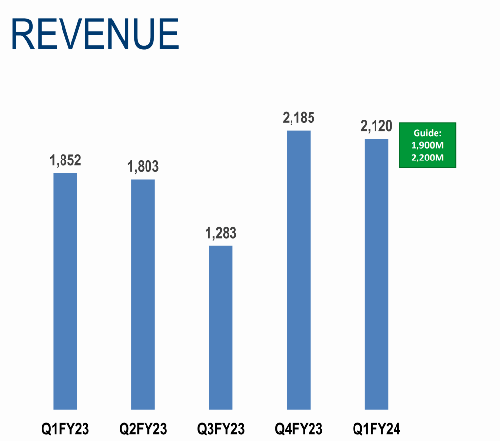 - 2024 Q1财报的核心,是21亿美金的营收,达成高达两位数14%YoY同比增幅,但是也要注意到这一季度和上一季度相比,已经出现了-3%QoQ的环比降幅。