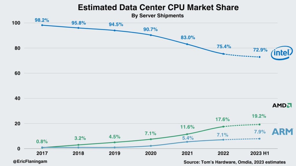 - 2023年,AMD的EPYC CPU业务继续抢占INTEL的份额