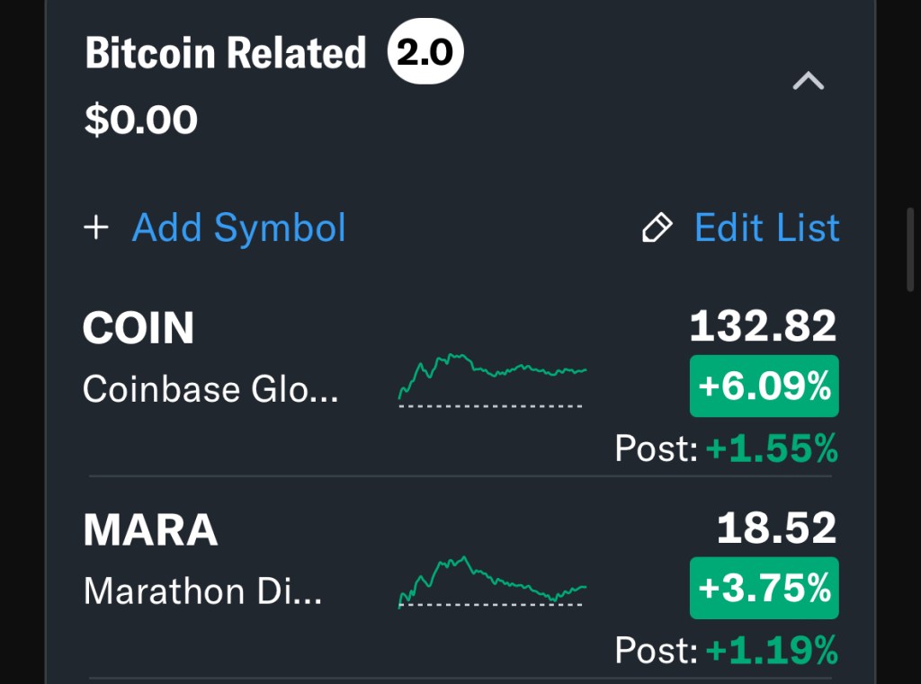 - 受此影响,BTC相关股票Coinbase和MARA日内大涨,其中MARA上涨10%后回吐部分盈利,收在3.75%;COIN一路上涨到6%。盘后,这两只股票继续小涨1%左右。