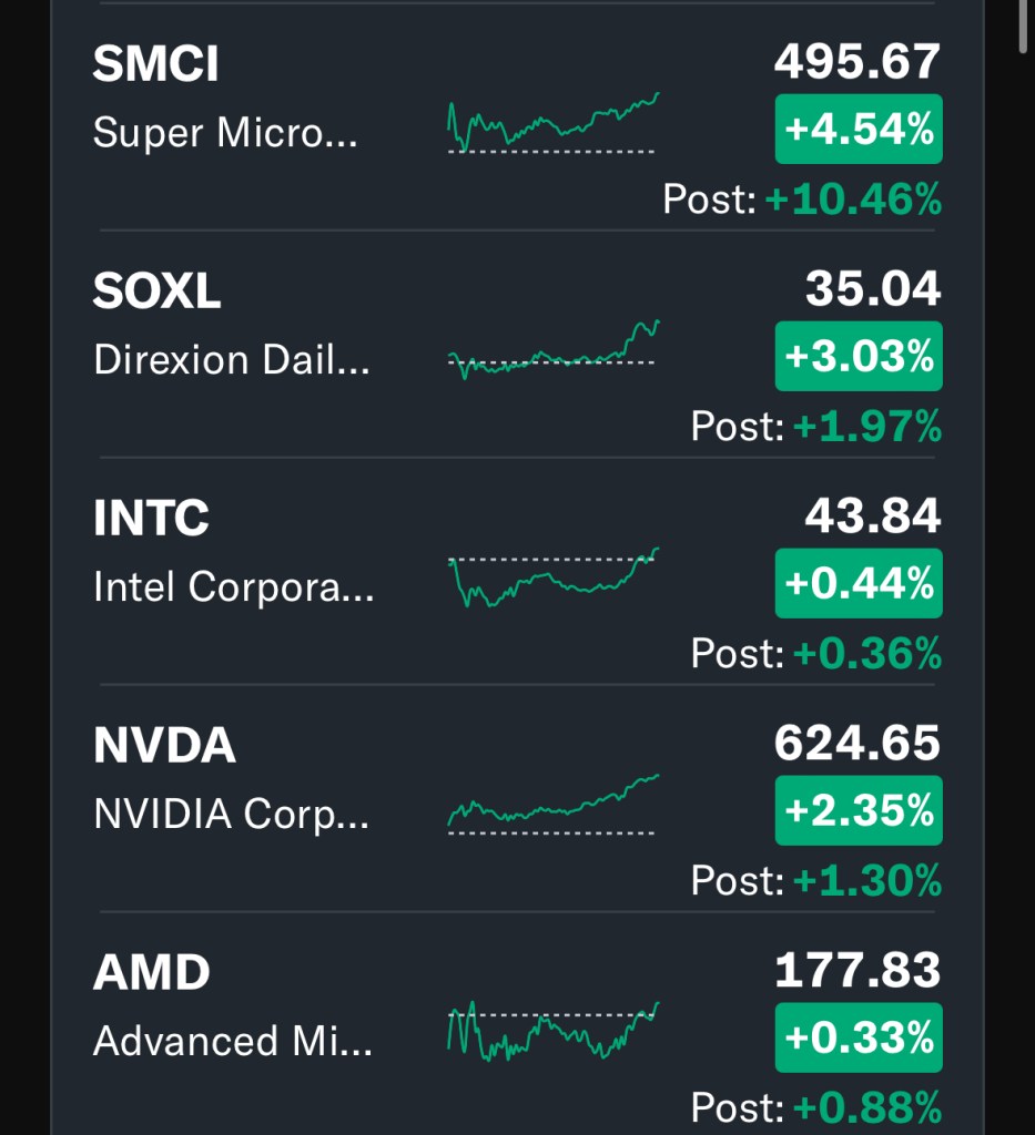 - 受SMCI利好消息的影响,盘后NVDA继续抬升至历史新高,soxl继续上涨,AMD也小幅上涨