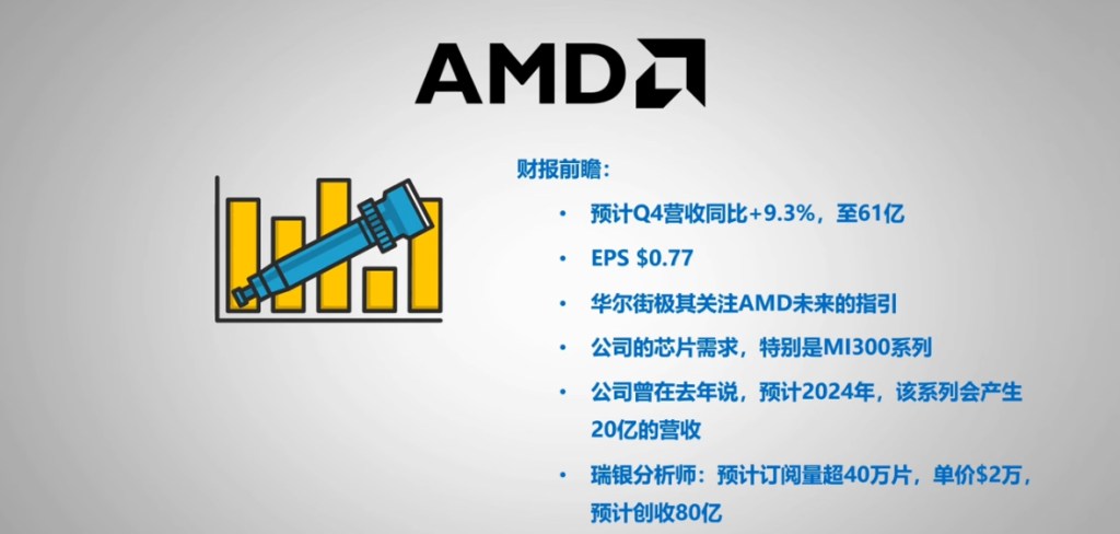 - 据瑞银分析师估计,2024年AMD已经拿到约40万AI GPU(如MI300系列)的预定量,总计价值为80亿美元;超过之前预期值4倍。这应该能让AMD的全年预期变得更为乐观。