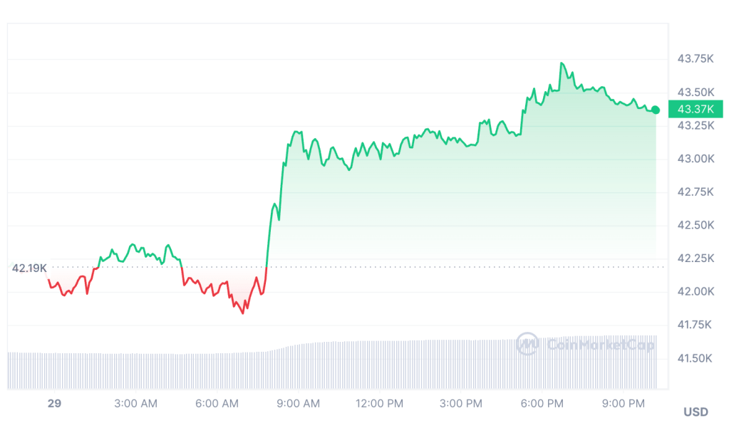 - 可能同样受到国债拍卖的利好消息刺激,比特币今天日内上涨3%,站稳43000。结束了过去半个月ETF通过以来被抛售而持续下跌的“小熊”。