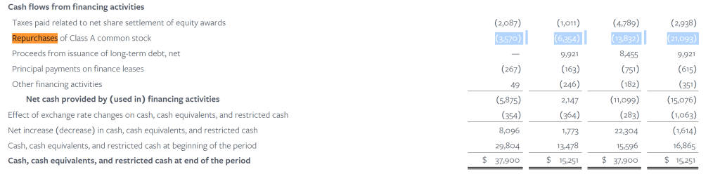 关于回购:我们看下面一张表就能知道其实23年Meta的回购和22年相比,并没有大幅增加。2022年前三个季度,Meta回购了总计210亿美金的股票;但是2023年前三个季度,Meta一共只回购了138亿美金。低于2022年的回购幅度。所以说23年Meta股价涨3倍主要是因为回购导致的,这并不符合实际。