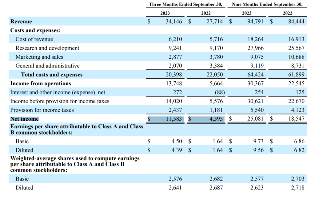 - 当然,最主要的是广告收入提升。总体收入从22年Q3的27.7亿,增加到了23年Q3的34.1亿,提升达23%,在美国利息如此高企,经济甚至出现衰退风险的当下,还能获得了两位数的广告收入增长。这一点应该是要令人震撼的。至于说这么强劲的广告增长到底来自哪里,和这一波AI浪潮有关吗?我们将在下文分析。