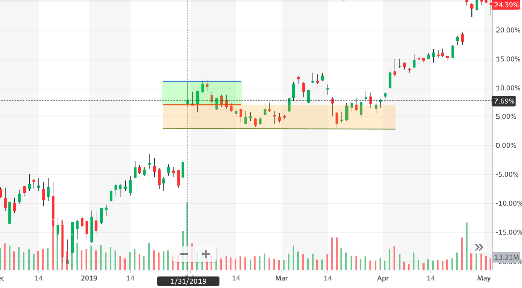 - 2019年1月31日星期四,当天暴涨大概13%左右,实际上当天日内收了一根很长的上影线,日内最高涨16%,盘尾跌回13%。