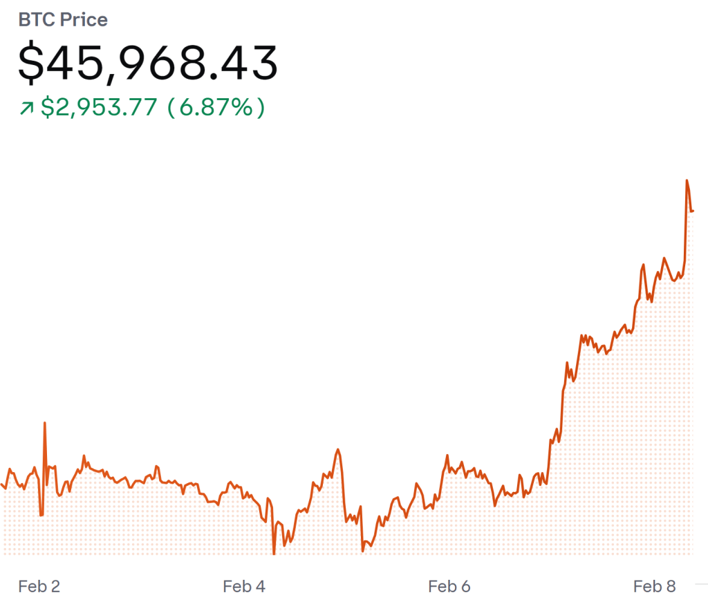 - 因区域银行地产暴雷,资金外逃避险,比特币最近一周大涨近7%,站上46000点大关,几乎已经完全收回ETF通过以来的跌幅。