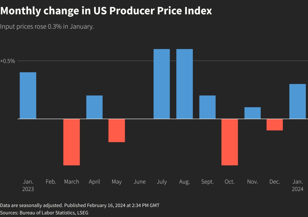 今天盘前公布的PPI数据显示,美国一月份的通胀超过预期。一月份PPI数据意外上涨,预期环比增长0.1%,实际增长0.3%,和去年同比增长也大超预期0.3个百分点。这已经不是本周第一次因为数据突变而改变市场的降息预期了。