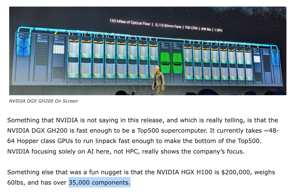 首先是NVDA产能得到大幅提高。注意,这里的产能并不是台积电生产GPU的能力,GPU早已被台积电生产出来,只不过他们按照高精度高规格封装在一块gracehopper主板上,需要额外的时间和工力。在Superchip上,要将每块H100芯片按照“18路”NvLink结构实现芯片级(Chip-to-Chip)的对齐互联,其难度可想而知。因此“封装”,才是之前NVDA产能不足且出货时间高达11个月的根本原因。
