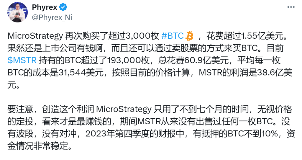 究其原因,可能与早盘爆出MSTR大举买入3000枚比特币有关。MSTR用自己公司的股票做抵押买BTC,买了BTC导致BTC大涨,然后自己公司的股票也跟着大涨,这样就有更多的钱抵押买币。群内有人评价这操作真是抽象,真把自己给玩成永动机了?