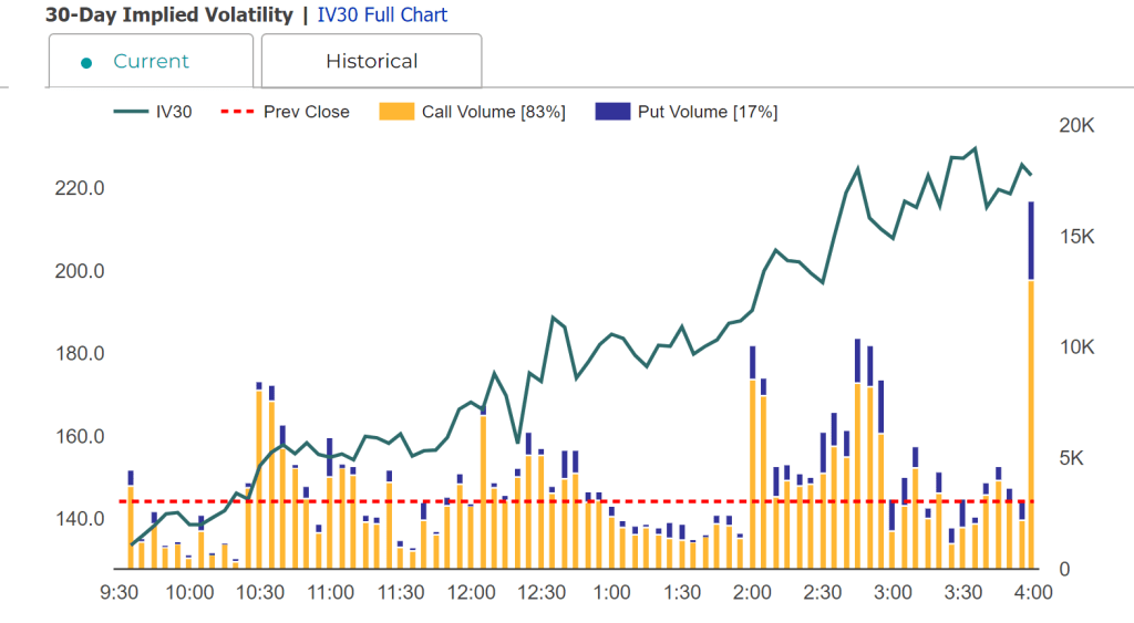 我们要恭喜上周买入SOUN的股民朋友们,但是一般出现这种非理性炒作的现象时,也往往意味着牛市进入尾声了。SOUN的IV(隐含波动率)已经达到惊人的220。我们需要提防未来几天可能出现的风险。对SOUN和相应风险的讨论,请参看本文文末我的看法与操作部分。