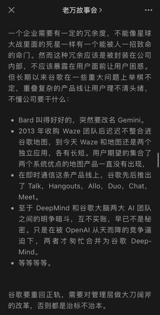 几乎在同一时间,网络上又传出了一篇关于谷歌内部领导层管理混乱,工程师文化丧尽,虽作为Transformer发明人却巧妙错过大部分AI机会,甚至要让CEO劈柴下台的檄文。
