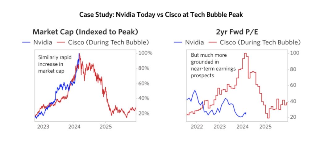 - 虽然很多人拿2000年的思科和NVDA做比较,证明他们都是泡沫,但一个显而易见的事实是,NVDA现在的2年后Forward P/E比思科小很多,仅为不到40。