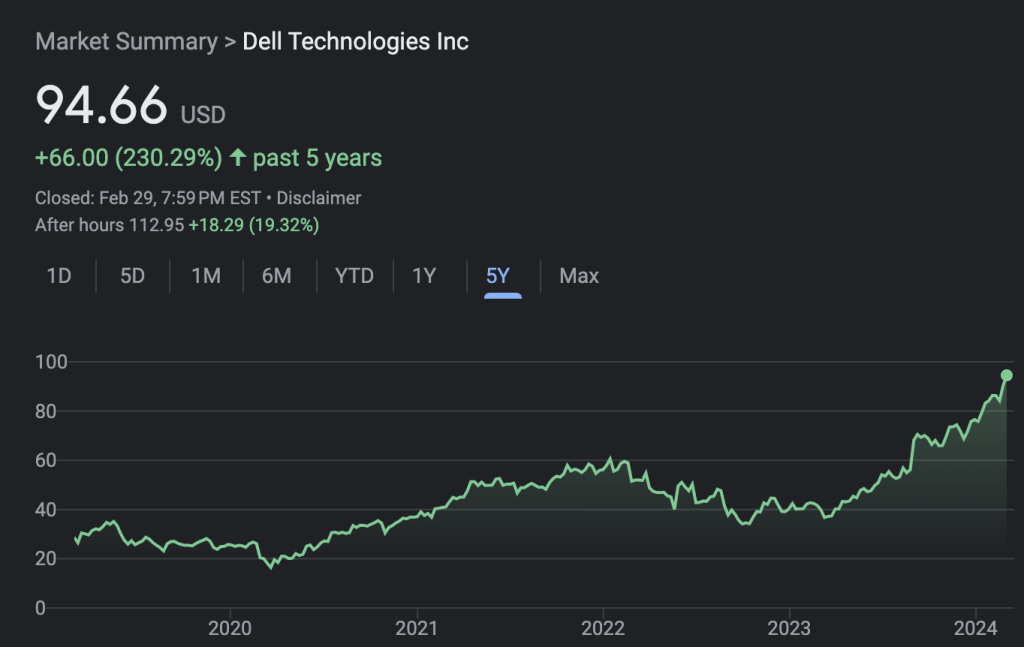 - 实际上,从2023年5月份的低点至今,DELL的股价已经累计上涨了154%,翻了一倍有余。