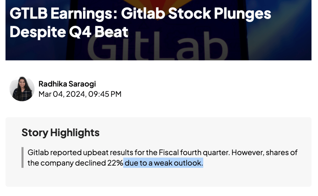 - Gitlab盘后发布财报,因指引不及预期,财报后GTLB股价暴跌22%
