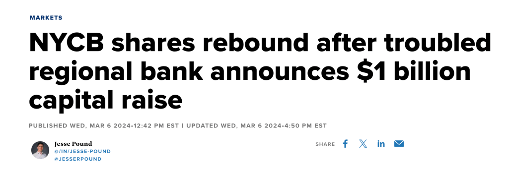 - 因高息环境下商业地产贷款坏账,导致Q4意外记损2.6亿美金,NYCB开盘后延续了本周以来的跌势;今天盘中一度大跌40%,让早上抄底的人欲哭无泪。市场随后停盘,等待NYCB宣布的一项重大消息。