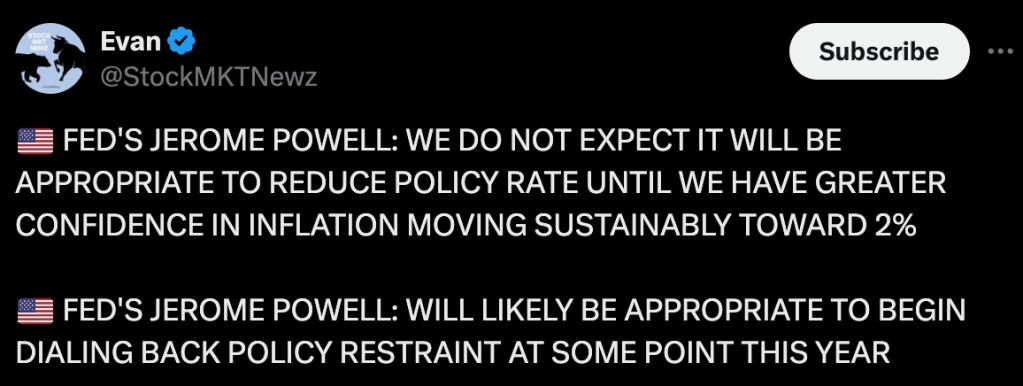 这段话听起来鹰派,前半部分属于老调重弹。但实际上是确认了市场对于今年至少会开始降息的猜测。一鹰一鸽,可以认为互相抵消。我们再来看他下一段发言: