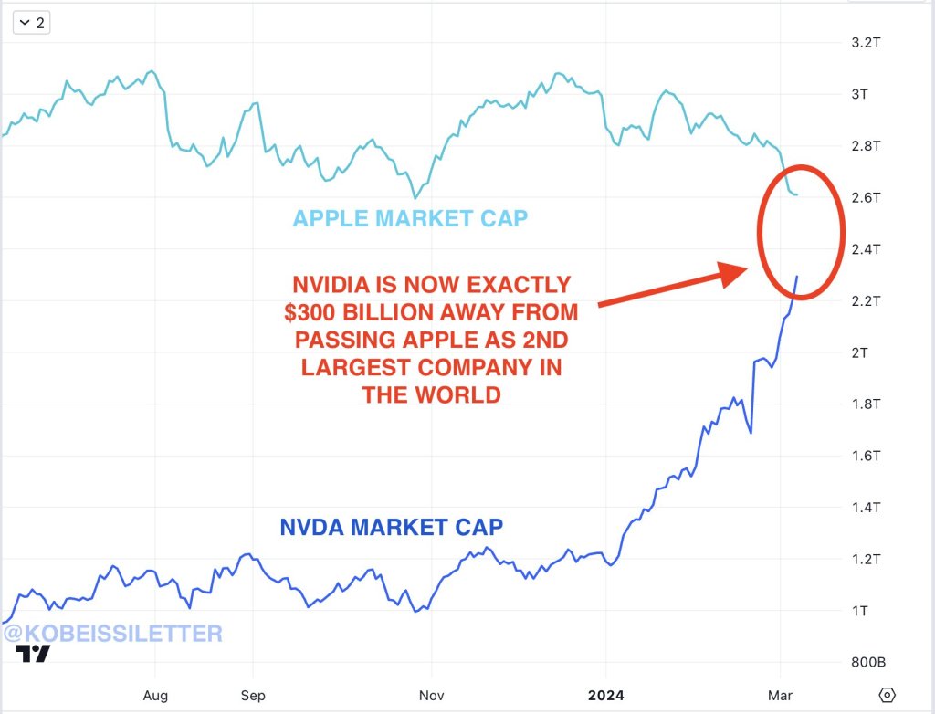 这里我们先来一起复习一个冷知识:一周以来,NVDA已经上涨了23%;一个月以来,这个数字是36%;从年初至今,它则为惊人的94%。在3月份的GTC大会之前,这个数字很可能会变成100%。那么前三个月翻倍好像也不是特别遥远了。这只股票不断有基本面消息利好推动,同时又有广大机构和散户不断提供“动能”。他的确可能成为2024年全美股票历史上新的神话。