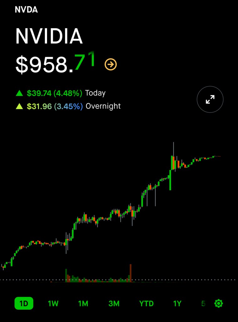 其中,NVDA一天之内大涨4.5%,直接冲破$920大关。更令人难以置信的是,NVDA在盘后继续上涨,最终略收于$950下方。在Robinhood的24小时市场中,NVDA现在的交易价格是$958。按照这个趋势,时隔8年,明天可能有望再次看到1字头的NVDA。
