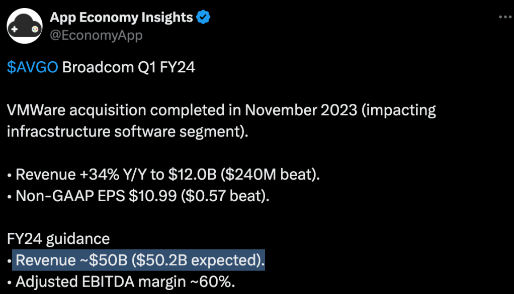 以AVGO为例,公司在Q4的EPS和营收均大幅超预期,并且数据中心的收入在23年同期大增4倍。可惜公司管理层给出24年的指引仅为500亿美金,低于预期的502亿美金,并未受Q4强劲需求影响大幅上调而令投资人失望,股价大跌。