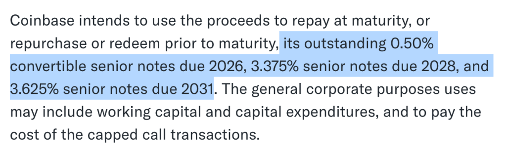 然而,COIN真的会遵循这么一个套路吗?答案或许会令人失望。在8-K文件中,COIN明确提到自己这笔10亿美金的融资,是用于偿还自己之前发型的于2026,2028和2031年到期的优先债。这表明,Coinbase的财务状况可能并没有我们想象的那么好;在过去几年特别是比特币的熊市之中,为了维持运营,他们发行了大量债务,本金和利息利息亟待偿还。