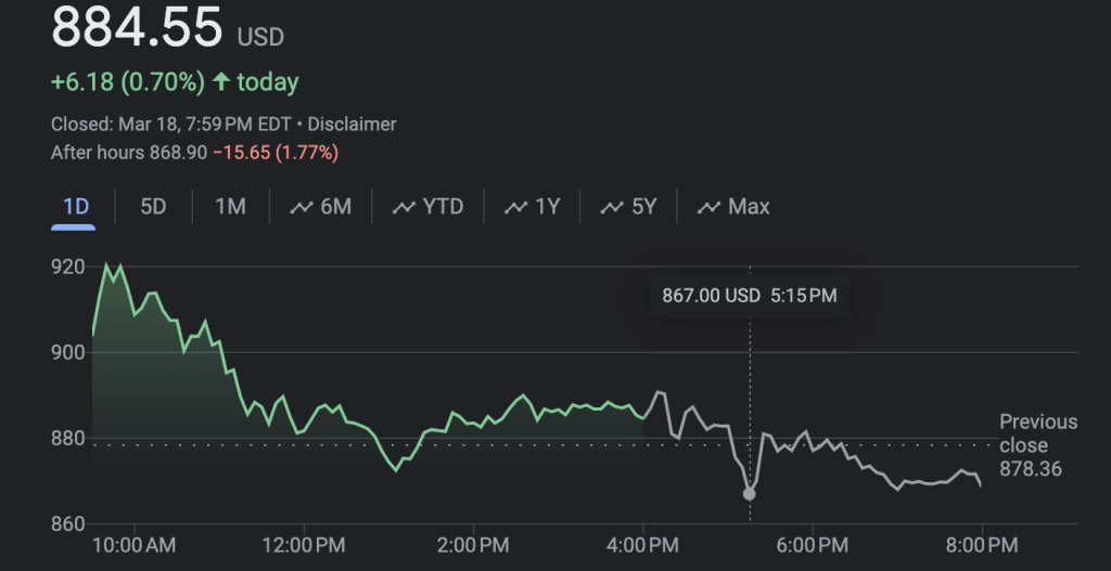 虽然GTC的发布会符合预期,新产品也利好长期股价,但是盘后英伟达却逆势下跌,一度跌至867;虽然随着NIM发布短暂回升至880,但随后继续下跌。最终收跌1.77%,收于870支撑位附近。