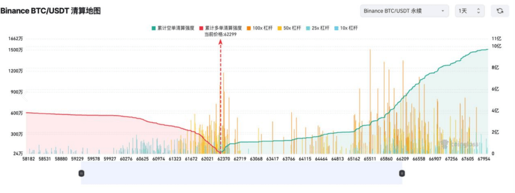 如果比特币可以在6万上方止跌,可能会多次测试6万1这个点位。因为按照最新的比特币的清算地图,6万1能够杀掉绝大多数10倍以上杠杆的看多仓位: