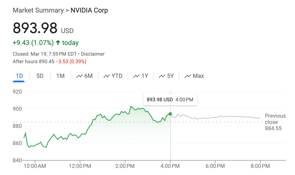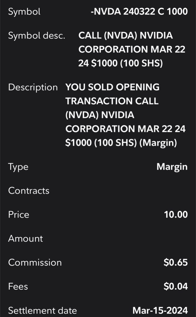 今天GTC结束之后,NVDA股价不涨反跌,加上重大事件过后期权IV Crash,这些Call的价格便一落千丈。最大行权价1000的Call累计下跌近90%,5天前卖的时候10块一张,今天买的时候已经只有不到1块了;行权价950的call也跌了很多。虽然如果等到周五OTM归零,我能吃到100%的利润,但既然已经赚了索性我就把他们卖掉。