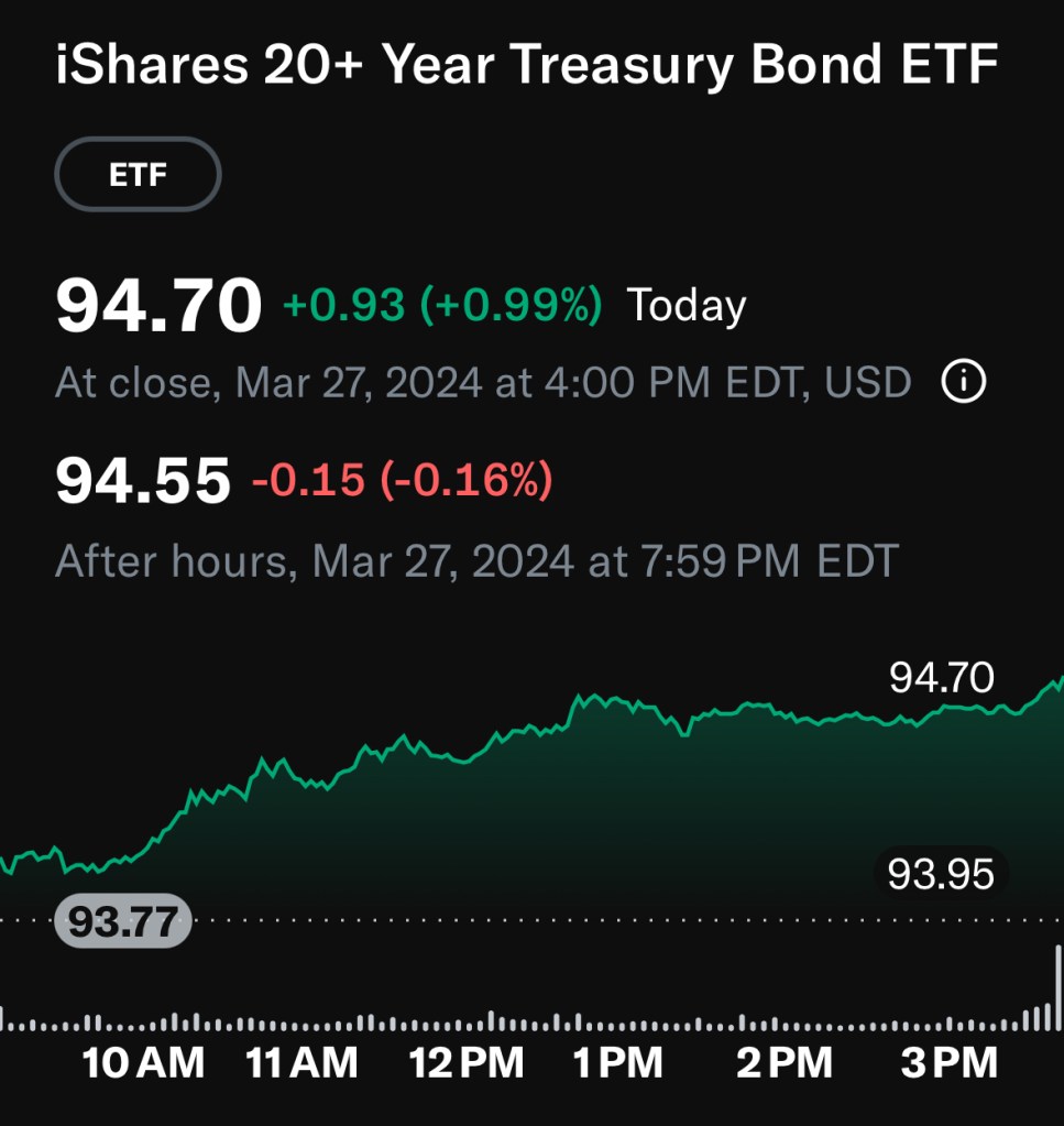 另外值得注意的是,过去三个月以来表现平庸的小盘股TNA今天却大涨6%。因降息预期不断推迟而下跌的国债TLT和TMF今天也逆势大涨1%和3%。