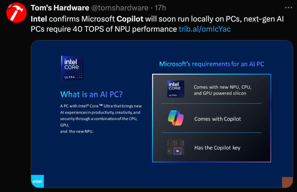 英特尔的大涨可能和AI PC即将正式推出有关。英特尔宣布,已确认微软的Copilot软件将会直接在本机运行。而英特尔则推出了全新的NPU芯片,专门处理深度学习的推理任务,以应对本地运行大语言模型的需求。