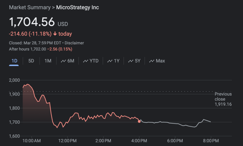 今天市场有几个比较大的变化。一个是比特币持币股MSTR被专业机构Kerrisdale Capital做空,股价大跌11%。其实这种幅度的的大跌对MSTR来说已经见怪不怪了。在本月中旬(约3月19日左右)比特币深度回调到6万1的时候,MSTR就曾暴跌近20%。