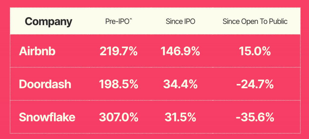 从历史上看,late-stage pre-IPO公司直到上市之前,投资人依然可能获得平均30-100%左右的回报。而公开上市之后,受限于市场环境和公司业绩,回报可能会大大不如这些早期投资者,甚至为负。