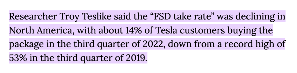 FSD对特斯拉的股价到底有多大帮助呢?华尔街实际上认为,FSD最大的问题是take rate太小,也就是真正购买的用户比例太低,最新数据显示不足14%。