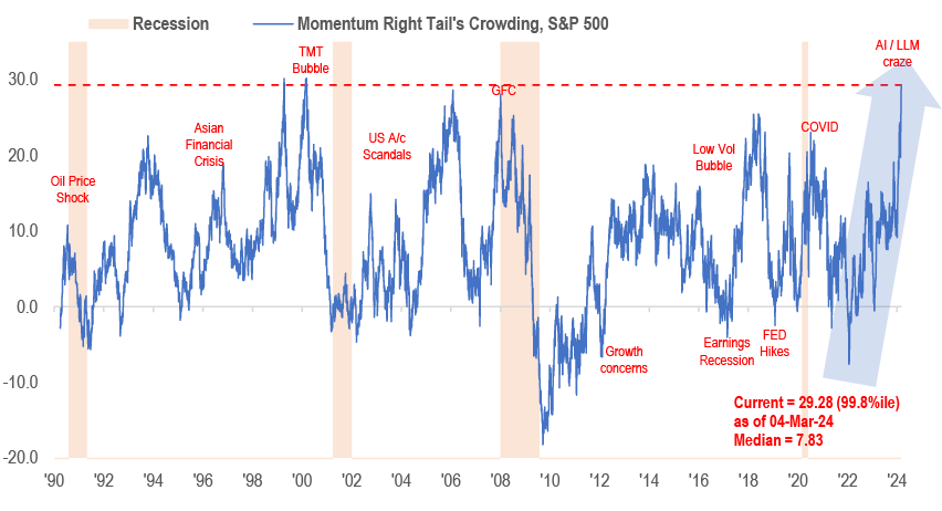 对于Mag 7而言,我认为会出现一定程度的长期横盘整理。实际上,在Q2如果他们不出现闪崩,就已经是非常好的表现了。下图是美国机构在趋势交易策略的拥挤程度,现已创下2000年互联网泡沫(TMT Bubble)以来的新高: