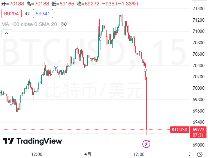 今天夜盘,比特币出现闪崩:在触及近71300后,比特币迅速跳水2000元,至69200。现再次收于7万元下方。