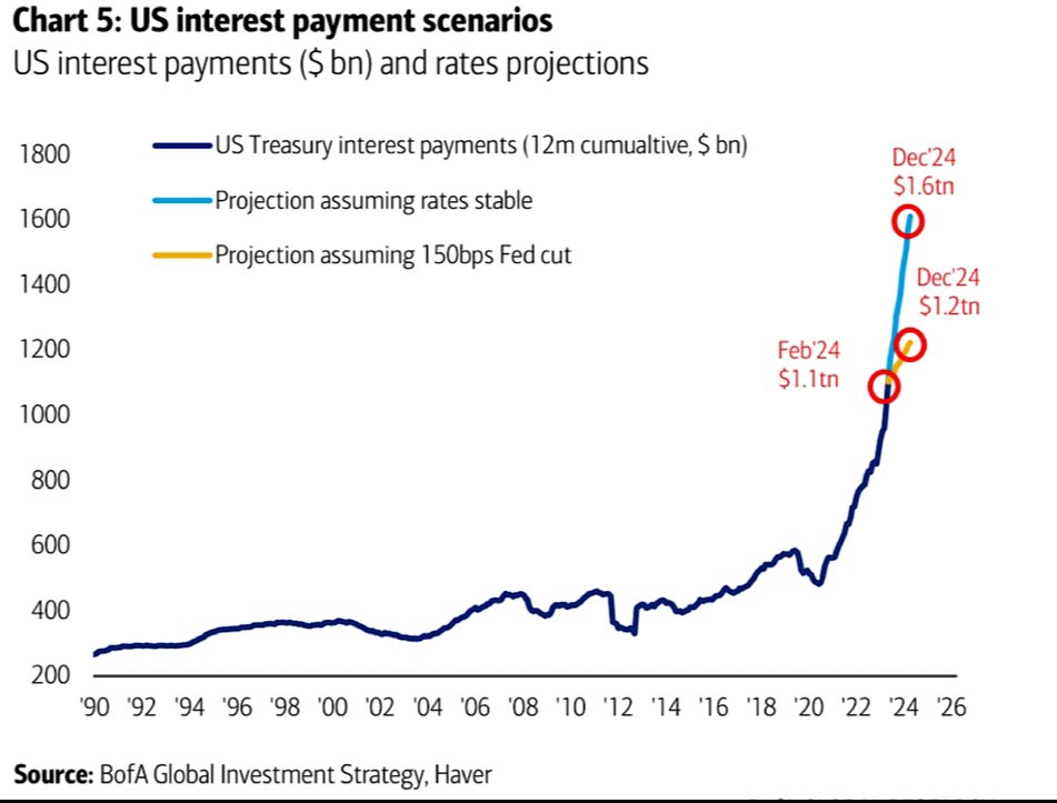 但2024年应该还是会至少降息一次。原因不是别的,而是美国政府的国债利息可能要撑不住了: