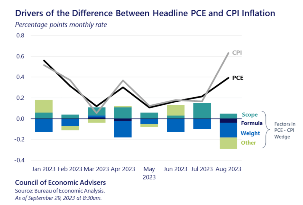 近年来,PCE和CPI最主要的差别,主要是由他们各项目之间的权重差异引起;其次是因为价格计算方式不同而不同(归结于Other一项)。一个例子是飞机票,CPI计算飞机票价的方法是用一个固定的航班组合计算平均票价;而PCE则是从航班公司中调取收入信息,除以当月乘客的总飞行距离得出。从这也可以看出,PCE统计的数据面更广,更能反映经济活动中价格变化的实际情况。