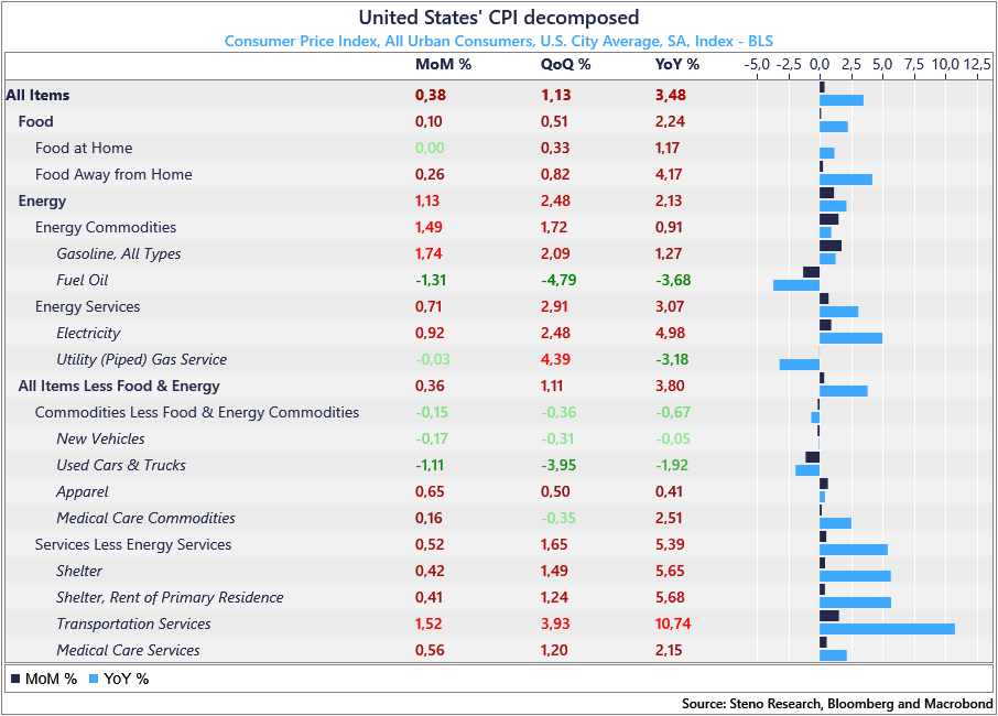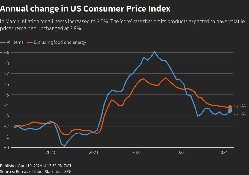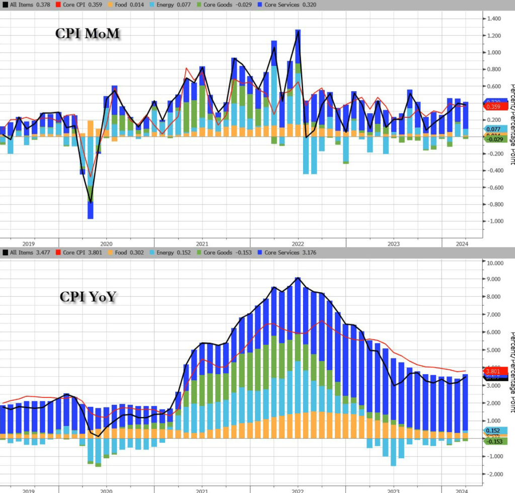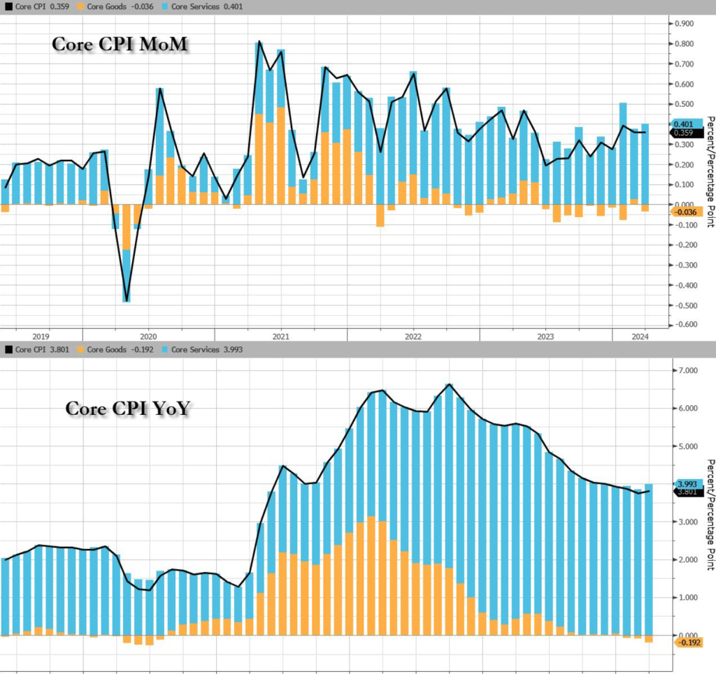 对决定美联储是否降息更为重要的核心CPI(也即CPI中去除能源和食品的部分),和今年2月相比,环比增长预测值0.3%,实际为0.4%,超0.1%;和去年3月相比,同比增长预测值3.7%,实际为3.8%,也超0.1%。