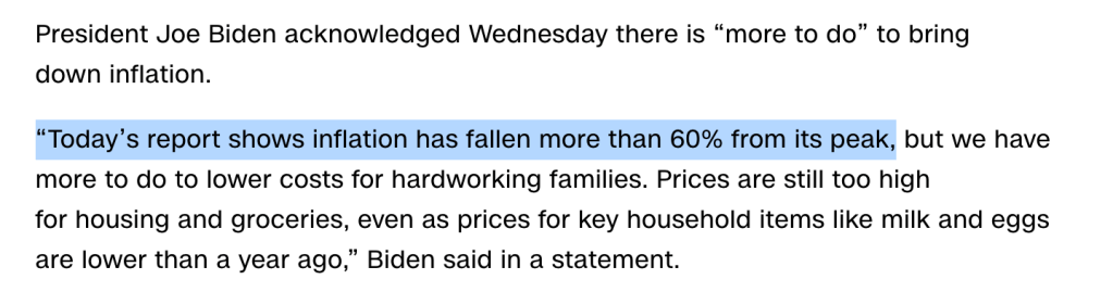 可能是知道通胀数据不好,为了安抚情绪,拜登总统也出来说话。他说,通胀距离最高点已经下降60%。