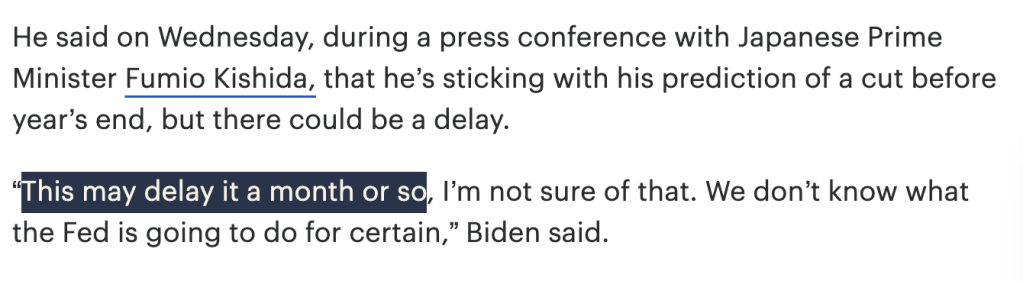 - 最后10%:可能是拜登发表讲话,说“今年年底一定会降息”,并且竟然破天荒的预测“因为通胀数据过热,降息时间推迟一个月左右”。是吗?是真的只推迟一个月吗,你真的确定吗,拜登先生?