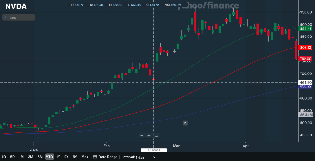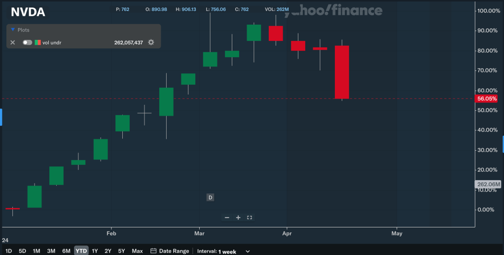 但自从月初CPI不及预期开始让市场忧虑、到鲍威尔上周确认抗击通胀失败、到伊朗周末袭击以色列,再到昨天以色列反击伊朗。今天为止,英伟达已经连续四周下跌,也是该股2022年来录得跌幅最大的一周:达15%。