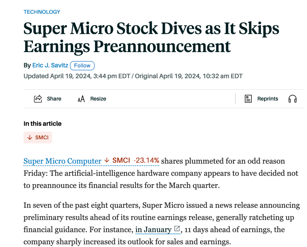 当然,今天下跌也不是完全没有“借口”。早盘,市场暴跌借口是以色列反击伊朗;开盘后,反击故事结束,借口则变成了“SMCI没有提前预告(pre-announce)2024一季度的财报”。