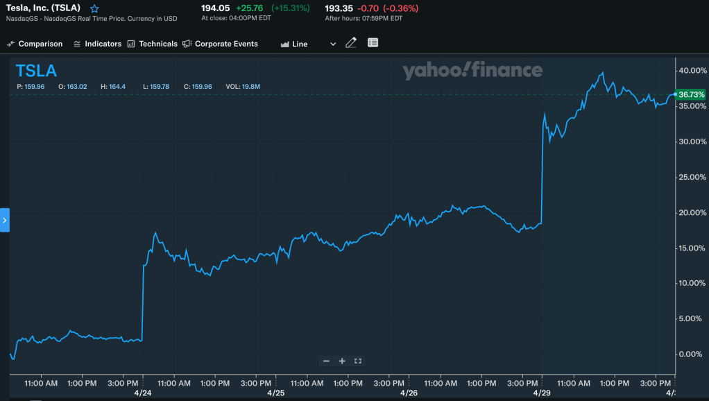 周一凌晨,TSLA在24小时交易所股价仅上涨5%;早盘开始后,价格一路飙升,直接冲到10%;开盘后继续涨5%,最终收涨15%,站上190上方。