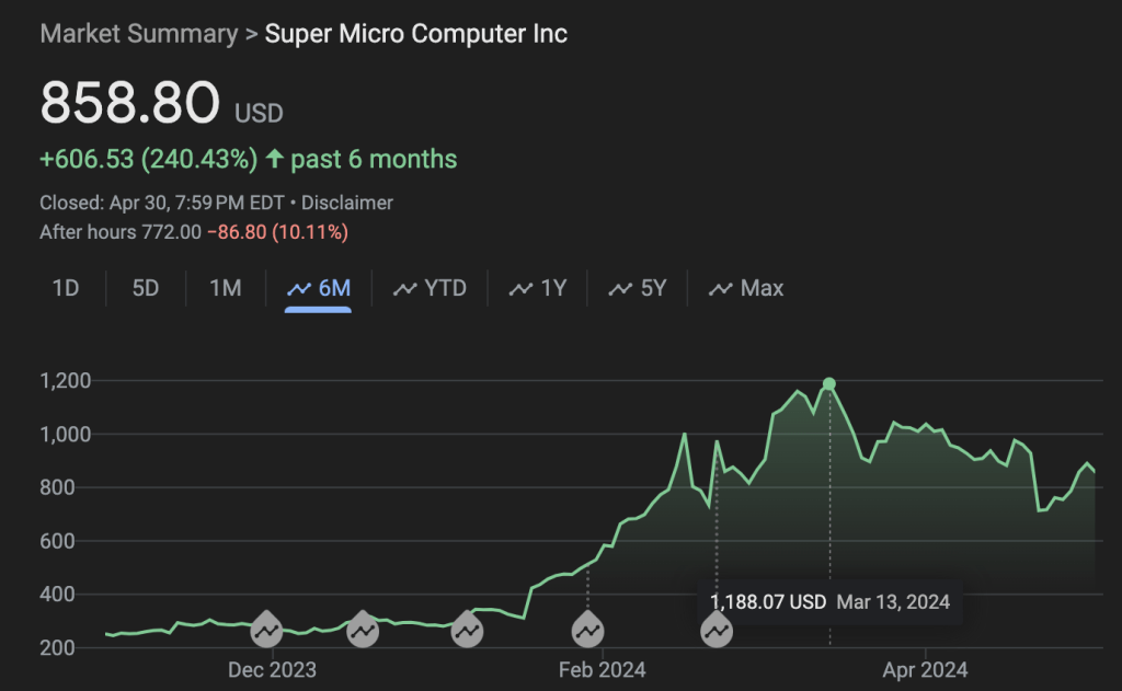 盘后下跌,更多可能是第一季度涨幅太高,价格回调压力太大所致。2024年短短的第一季度内,SMCI的涨幅最高达到316%,堪称个股奇迹。SMCI盘后并未跌破2周前黑色星期五的低点(710左右),表明市场认可长期业绩趋势不变,股价取得了暂时支撑。明天开盘后如果止跌可以适当抄底;但我自己不会去操作,我在AI GPU板块的仓位就集中在NVDA即可。