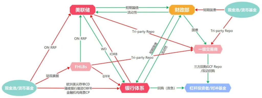 我在当时推特的回复下指出:美联储的流动性计算没这么简单;而且美联储的流动性,本身也不一定和股价、币价正相关。因为美联储各项工具对市场的影响机制,实际上非常复杂,如下图。如果未来有机会,我会写一期日报专门分析。但现在咱们只需要知道,美联储的各项工具主要目的是控制利率走廊(也就是利率的上下限),包括隔夜逆回购ONRPP余额也好,保证金也好,他们并不直接决定市场的流动性。真正决定市场流动性的资产,很可能不是别人,正是国债。