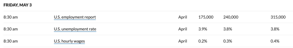 大家好,今天是2024年5月3日,星期五。早上8点半,美国劳工统计局发布重磅数据:4月美国新增就业人数17.5万人,远低于预期的24万人,为3月份的31.5万人的近一半。4月美国失业数据也开始反弹,失业率公布为3.9%,高于预期3.8%,无限接近4%,延续了几个月以来的平均上升趋势。而更让人惊喜的是,美国劳工的时薪增幅也开始冷却,环比实际增长0.2%,预期0.3%,前值为0.4%。
