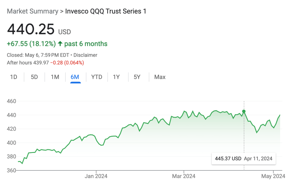 半导体芯片和AI板块领涨,其中英伟达涨近4%,Meta涨近3%;芯片板块小盘科技股ARM全天(含盘后)大涨8%,SMCI涨6%。三大指数齐涨,QQQ拉1%,直接涨回4月下旬回调的起点,距离历史新高4月11日的445点仅差不足1%。