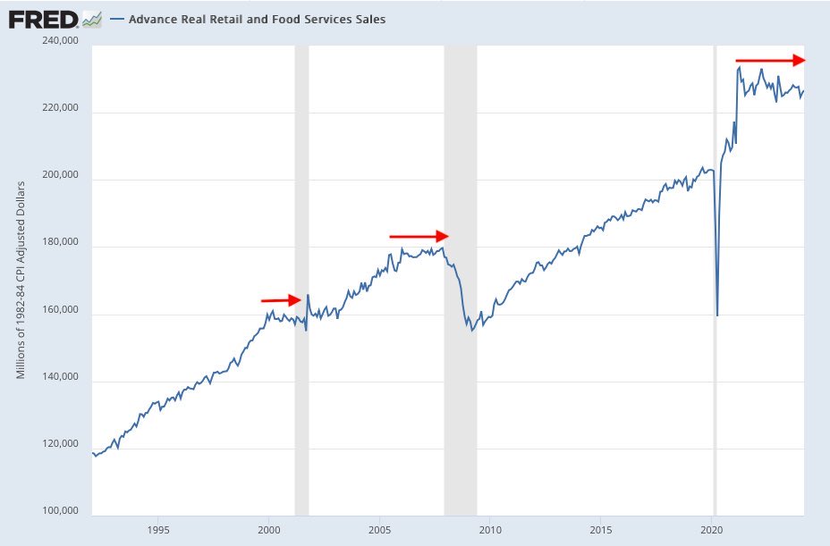 如下图,零售和服务销售增长已经陷入一段时间的停滞,而从历史上看,这往往就是衰退的前兆。而我们日报一直以来都认为,美联储一旦被迫或加速降息基本意味着衰退,这将不可避免再次引发崩盘;降息的不断推迟实际上暗示着经济数据强劲,美国就业率强劲,对股市生死线事实上起到了支撑作用。