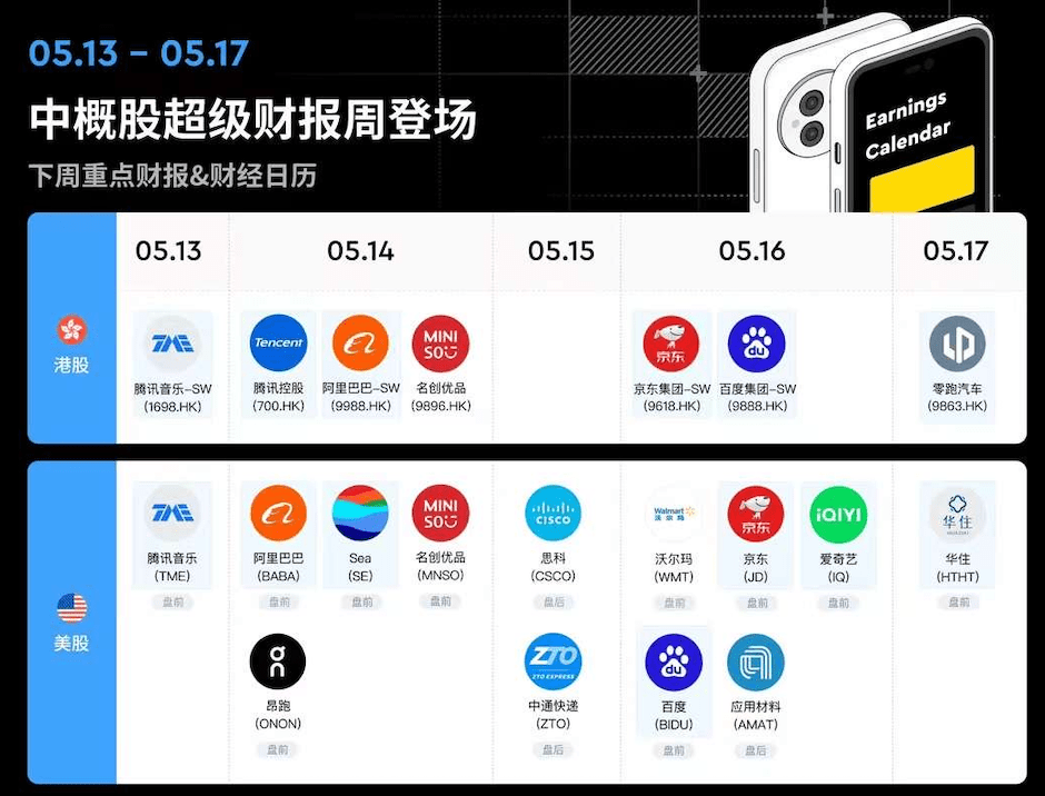 下周,多家超级中概股发布财报,周一,腾讯音乐;周二腾讯和阿里巴巴;周四京东,爱奇艺,百度。这都值得大家关注。